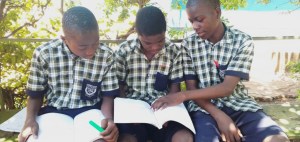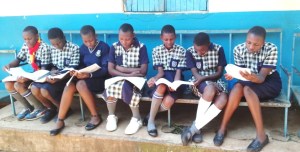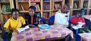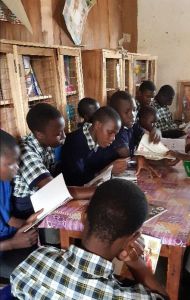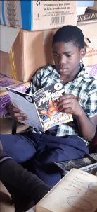 Pupils in the School Library avidly reading the donated text books and story books